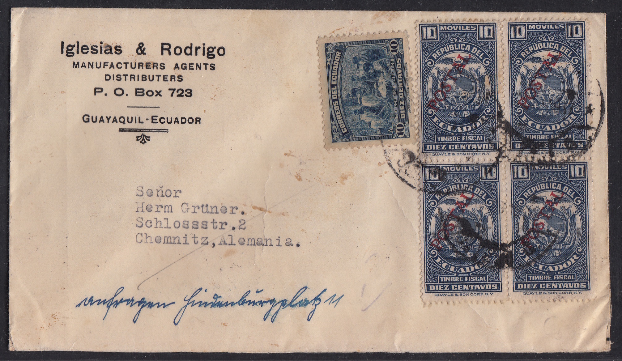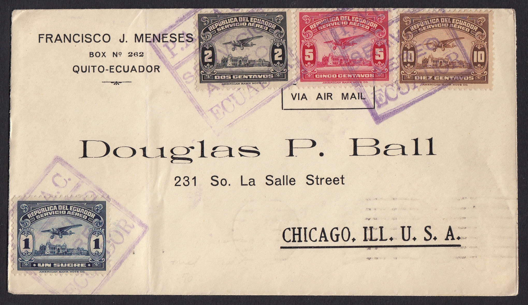 Über Generationen hinweg mussten Briefe aus Equador mit dem Schiff die Westküste Südamerikas hinauf in die USA befördert werden. Zwei bis drei Wochen musste sich dann der Empfänger gedulden, bis er den Brief in seinen Händen war. Im Mai 1929 gab es dann eine schnelle Beförderung - die Luftpost. Nach nur wenigen Tagen war die Strecke bewältigt. Dieser Erstflugbrief legte nur einmal einen Zwischenstop in der Kanalzone ein, eher er in Chicago eintraf. Das der neue Service seinen Preis hatte und der Luftpostbrief ein vielfaches des gewöhnlichen Briefes kostete, nahm man sicher gern hin.