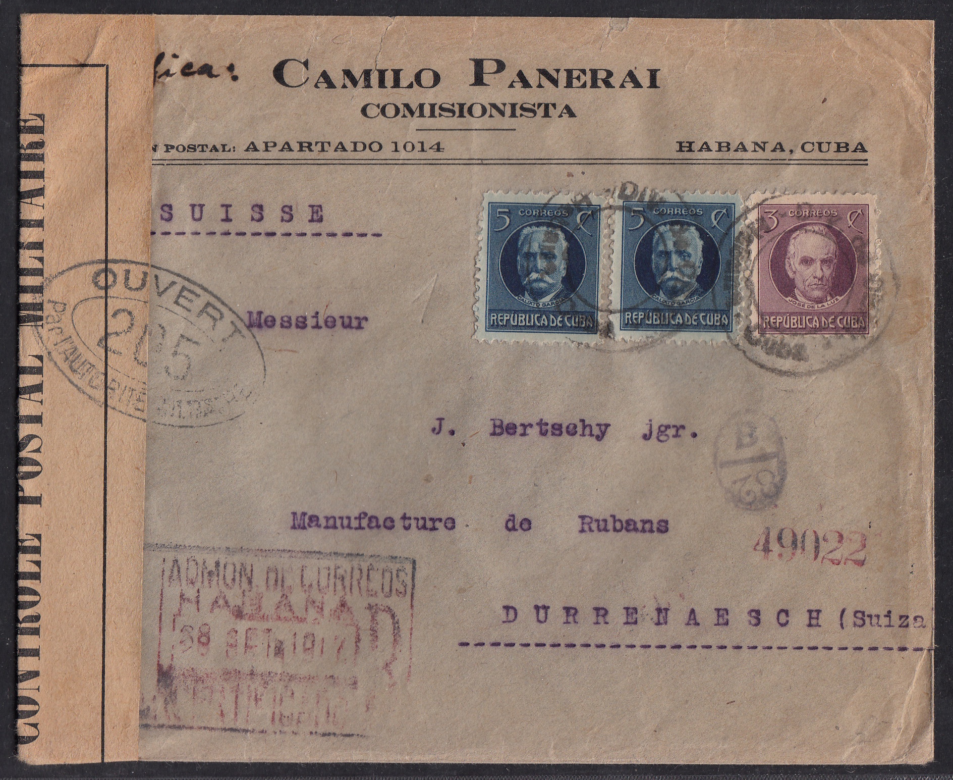 > Manchmal sind auch einfache Dinge nur schwer zu bekommen. Jedenfalls legt dies dieser eingeschriebene Brief aus Kuba das nahe, der am 8. September 1917 in Havanna auf die Reise ging. Ein gewisser Camilo Panerai, der als "Comisionista", also als als Großhändler, in Kubas Hauptstadt tätig war, bestellte in Dürrenaesch in der fernen Schweiz Bänder. Welcher Art sie waren, wissen wir nicht, aber in Kuba selbst konnte wohl niemand diese Ware fertigen. Die Lieferung dieser Bänder dürfte nicht so einfach gewesen sein, schließlich befand sich Europa im Ersten Weltkrieg und der Seeweg über den Atlantik war von Großbritannien gesperrt. Auf seine Bänder dürfte Senior Panerai sicher etwas gewartet haben.