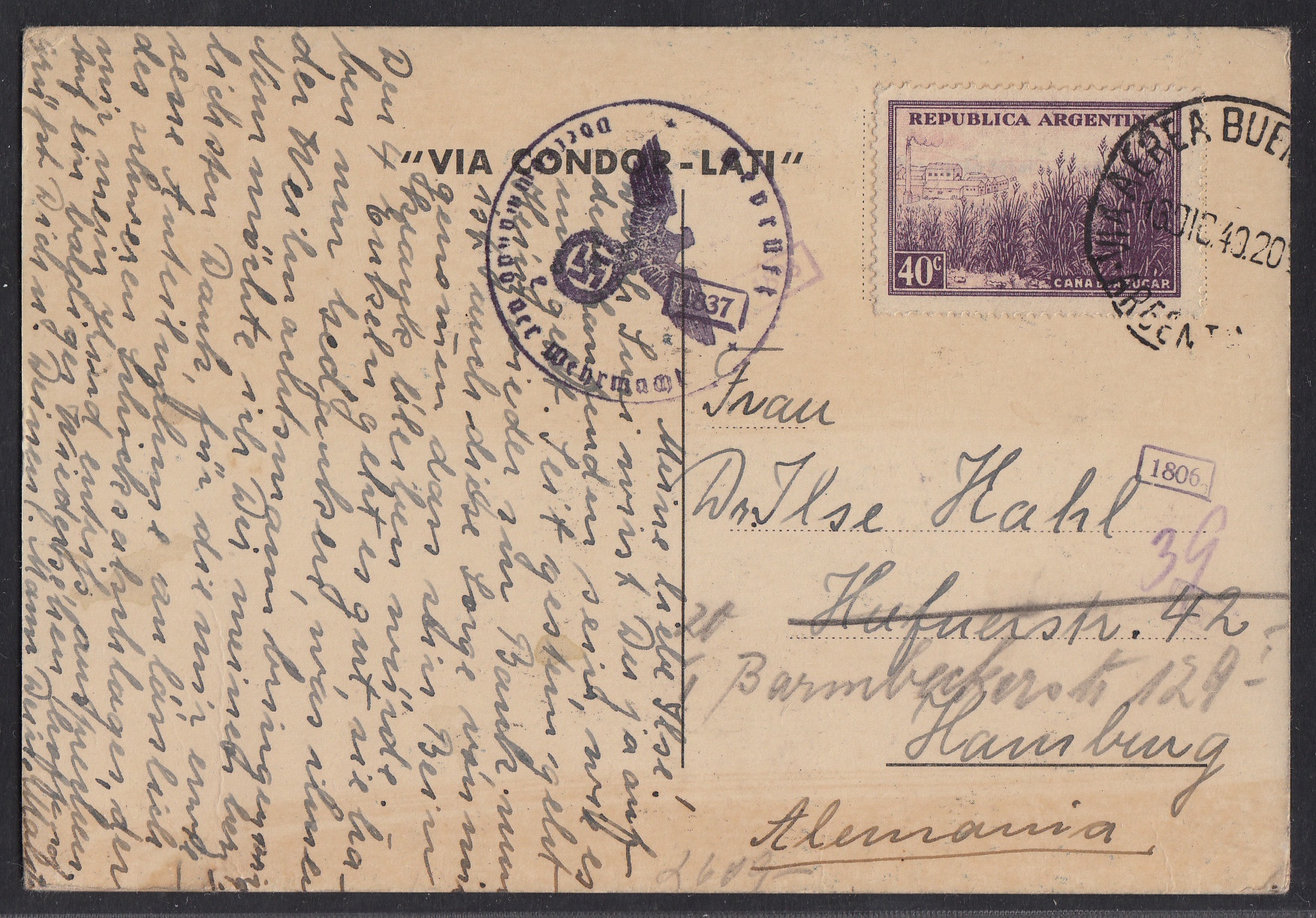 > Die Luftpostgebühren von Südamerika nach Europa - und auch die in der Gegenrichtung - waren bis in den Zweiten Weltkrieg hinein recht teuer. Die deutsche Fluggesellschaft Condor, die ab 1939 mit der italienischen Lati die Flüge über den Atlantik organisierte, hatte sich daher etwas einfallen lassen, um gerade zu Weihnachten und Neujahr Grußkarten attraktiv zu machen. Es wurde für den Zeitraum Mitte Dezember bis Mitte Januar ein speziell reduzierter Luftpostzuschlag angeboten, um Grußkarten schnell nach Europa befördern zu können. Dazu wurden auch attraktive Formulare mit künstlerischer Gestaltung aufgelegt - wie diese hier in Argentinien verwendete von Ende 1940. Sie koste nur 40 Centavos - 10 Centavos Postkartenporto und 30 Centavos Luftpostzuschlag. Regulär wären für den Luftpostzuschlag 1,25 Pesos zu zahlen gewesen.