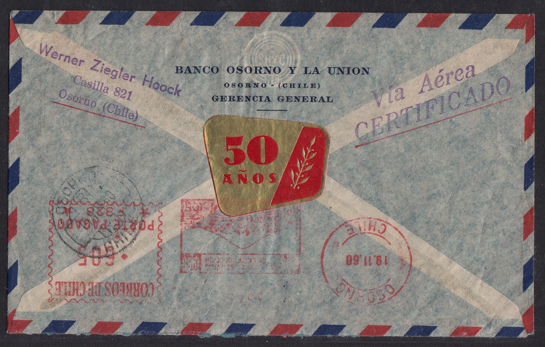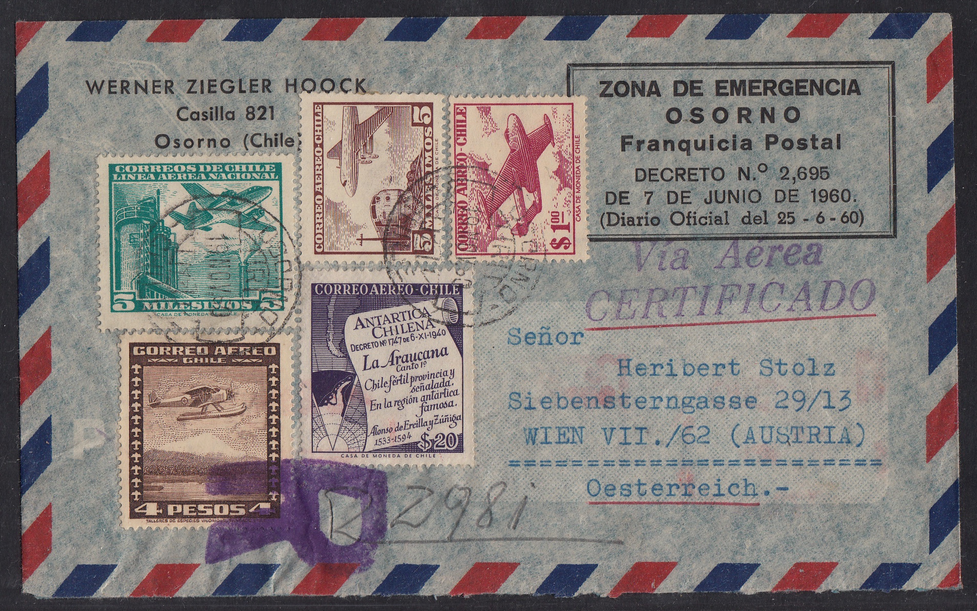 > Am 22. Mai 1960 ereignete sich im Süden von Chile das schwerste Erdbeben, das jemals aufgezeichnet wurde - ein sogenanntes Megathrust-Erdbeben. Die Amplitude erreichte eine Stärke von 9,5 auf der Richterskala; bis zu 6000 Menschen wurden getötet, etwa 3000 verletzt. Besonders die Stadt Valdivia wurde schwer verwüstet, aber auch andere Kommunen verzeichneten schwere Schäden; etwa das ca. 110 Kilometer südlich gelegene Osorno. Die chilenische Regierung richtete für das Katastrophengebiet eine Zone ein, in der Portofreiheit herrschte. Auch Post dorthin war gebührenfrei. Der hier gezeigte Brief einer Bank in Osorno trägt einen Eindruck, der die Gebührenfreiheit bestätigt; er ist mit Luftpost und Einschreiben nach Österreich geschickt worden. Interessant ist, das einige Marken und auch der Freistempel auf der Rückseite noch die bis Dezember 1959 gültige Peso-Währung aufweisen, die übrigen Marken aber in der neuen Escudo-Währung gehalten sind. Eine seltene Mischfrankatur, wie sie attraktiver nicht sein kann.
