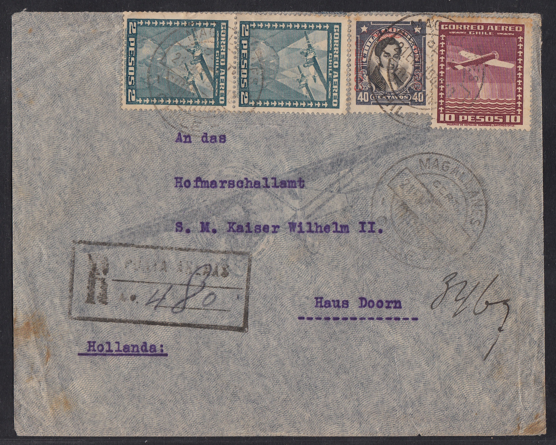 Am 21. Januar 1938 gab Carlos Strauss in Punta Arenas im Süden Chiles einen Brief ins ferne Europa auf. Empfänger war nicht irgendwer: Der Brief ist an den früheren deutschen Kaiser Wilhelm II. im niederländischen Exil auf Schloss Doorn gerichtet. Was wollte Senor Strauss vom Ex-Kaiser? Verspätete Neujahrgrüße ausrichten? Um Hilfe bitten? Wir wissen es nicht. Auch die Paraphe auf der Vorderseiten ist unklar. Ein zeithistorischer Beleg ist der Brief in jedem Fall.