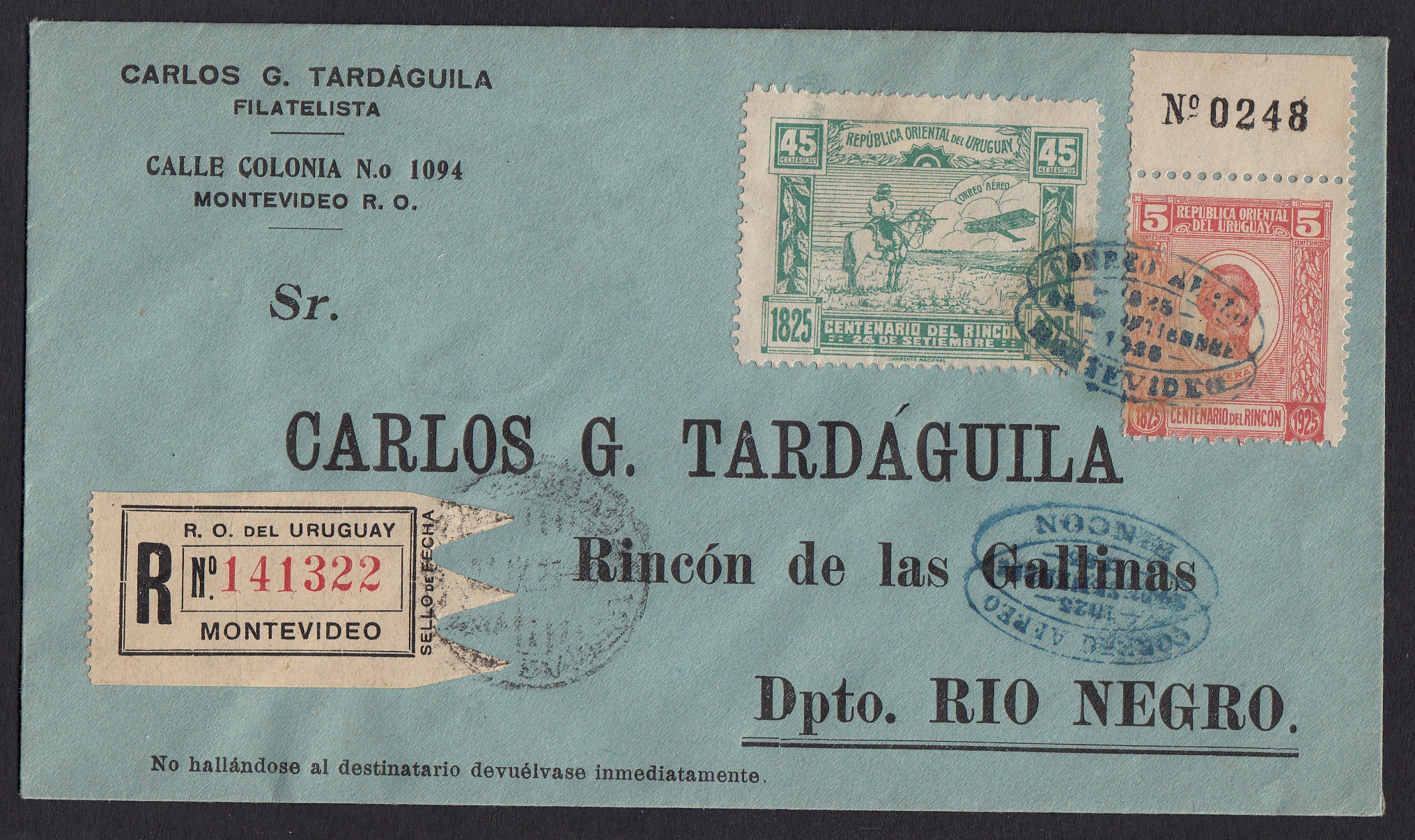 Wer im Jahr 1925 in Uruguay einen solchen Brief aufgeben wollte, der musste sich beeilen. Die grüne Luftpostmarke im Wert zu 45 Centimos war nur am Ausgabetag, dem 25. September, gültig und wurde nicht postfrisch verkauft, sondern durfte nur von den Postbeamten verklebt werden. Sie deckte das Porto für den Erstflug von Montevideo nach Rincon ab - einen Flug innerhalb des kleinen Landes. Das vernehmlich Philatelisten die Marke verkleben ließen, ist nicht verwunderlich.