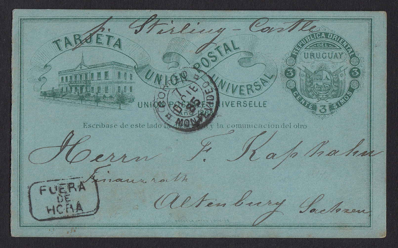 Am 7. Dezember 1885 verschickte ein Bekannter aus Montevideo, der Hauptstadt von Uruguay, diese frühe Ganzsache an einen Freund im sächsischen Altenburg um schon einmal ein gutes neues Jahr zu wünschen. Die Karte musste früh verschickt werden, um zum Jahreswechsel in Deutschland zu sein. Versendet werden sollte die Ganzsache mit dem britischen Passagierschiff "Stirling Castle" (Bild oben), die erst 1882 vom Stapel gelaufen war und bis 1884 "North America" hieß. Ob die Karte wohl das Schiff erreicht hat? Vorne wurde der Stempel "Fuera de hora" abgeschlagen, die Karte war also aufgeliefert worden, als die Post die abgehenden Sendungen schon verschickt hatte. Einen Ankunftsstempel hat die Karte leider nicht erhalten. Wir wissen also nicht, ob die Grüße rechtzeitig angekommen sind.