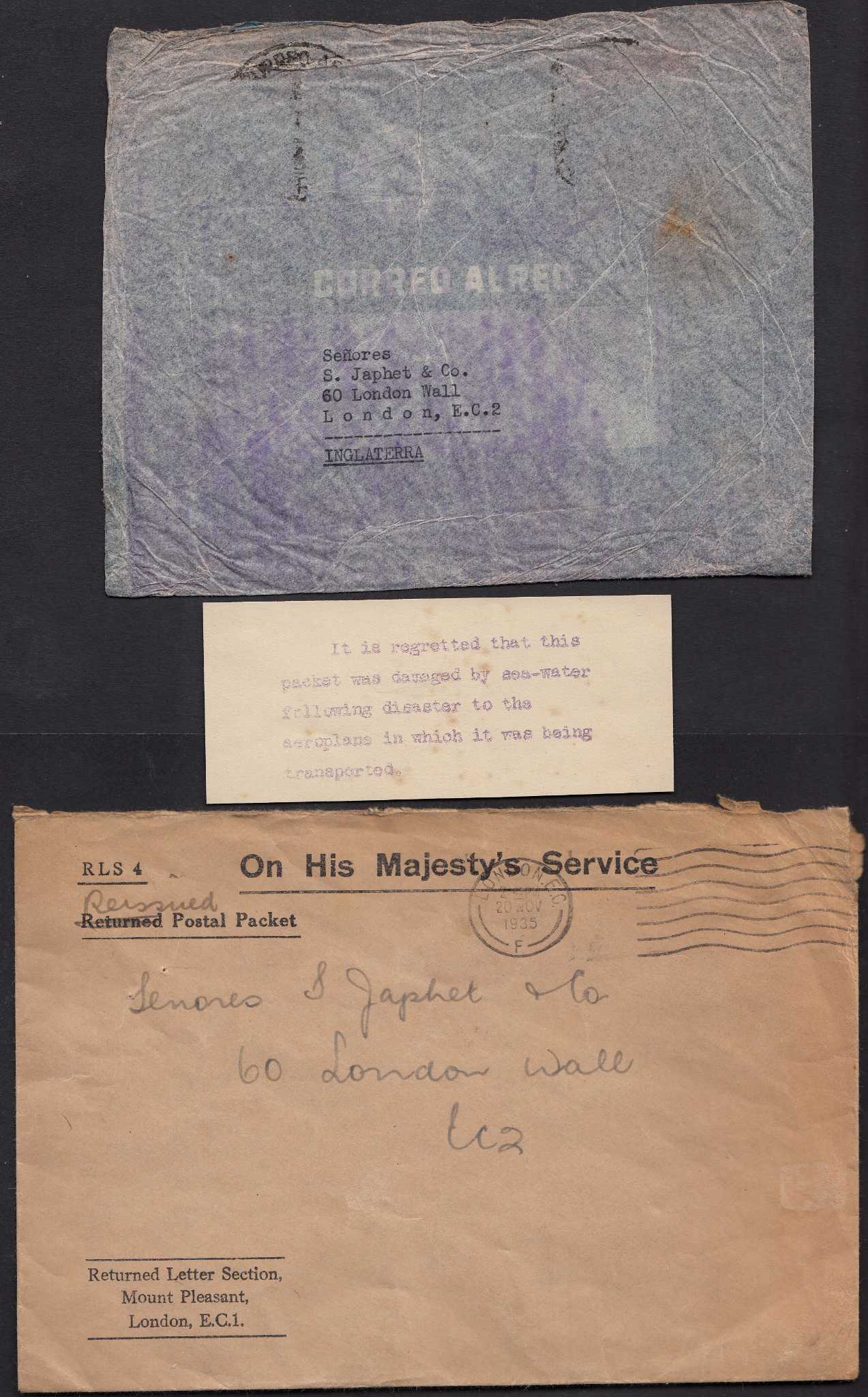 Am Abend des 1. November 1935 startete in Valparaiso der französische Flug "Santos Dumont" Richtung Europa. Mit an Bord: Zahlreiche Luftpostbriefe aus Chile für den fernen Kontinent. Die erste Etappe verlief gut, obwohl die mehr als 6000 Meter hohen Anden zu überqueren waren - für die Piloten und Flugzeuge jener Zeit keine einfache Herausforderung. Nach dem Start in Buenos Aires mit Kurs Richtung Brasilien jedoch geschah die Katastrophe: Das Flugzeug stürzte am 3. November bei Aracayu ab. Am Strand wurde später Trümmerteile und einige Postsendungen gefunden. Die Marken hatte das Meer abgewaschen, doch die Sendungen wurden mit einem späteren Flug an ihr Ziel gebracht. Am 20. November 1935 wurde der arg ramponierte Umschlag von der Rückbriefstelle der britischen Post in London in ein Kuvert gesteckt, als "Neu versandt" gekennzeichnet, und mit einem erklärenden Beilagezettel dem Empfänger zugeschickt. Der dürfte ihn mit einem flauen Gefühl gelesen haben.